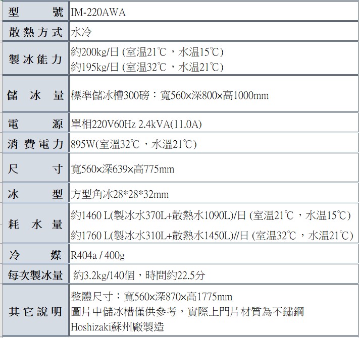 星崎 220公斤方型冰製冰機(蘇州廠) IM-220AWA
